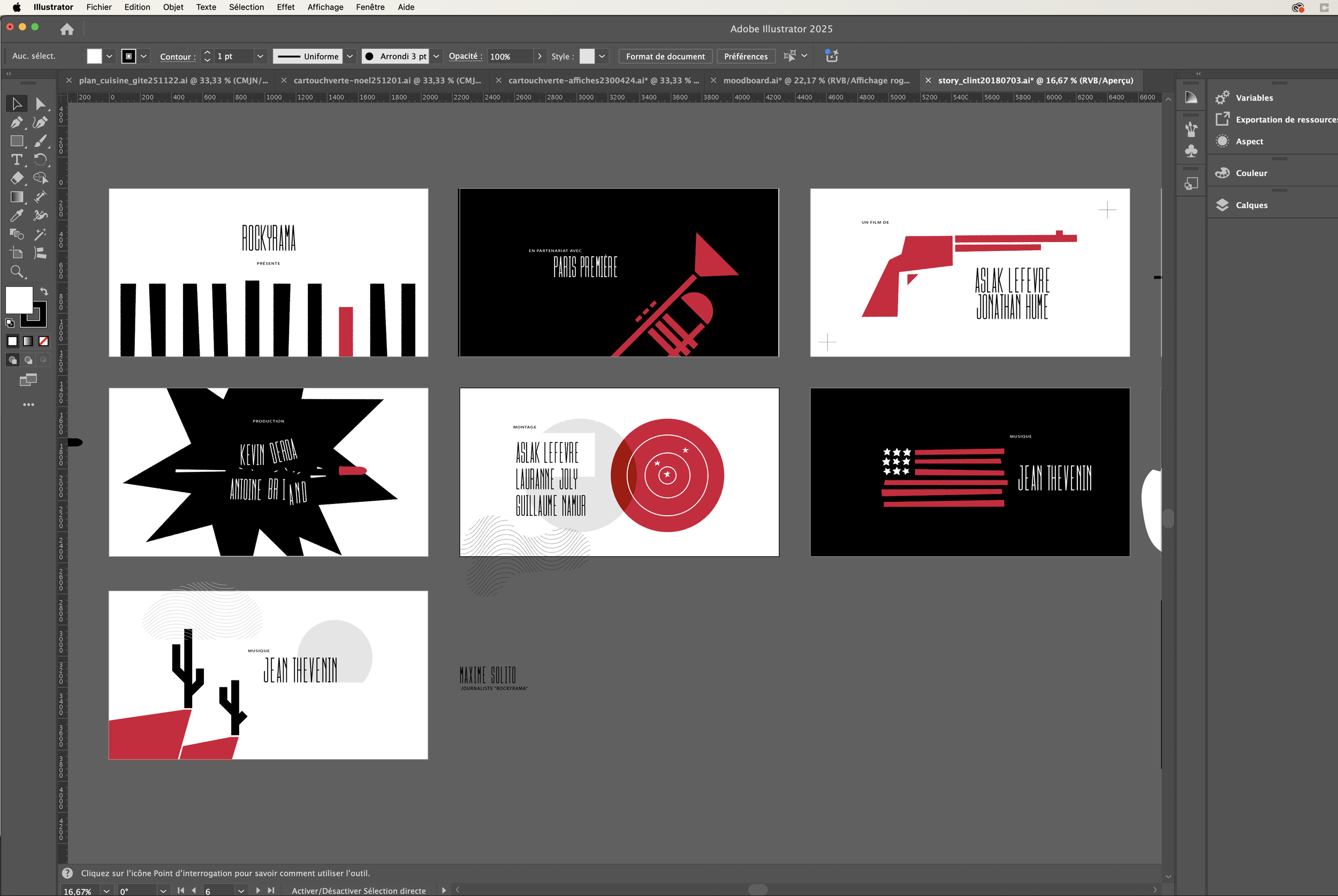 J’ai travaillé en deux étapes pour la créations des plans. D’abord la composition, la création des formes monochromes en vecteurs et le choix des typographies sur Illustrator.